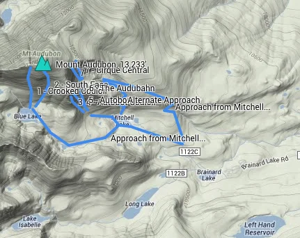 If the conditions are right, the South Face of Mount Audubon can provide a ski descent directly from the summit. The South Face is a broad couloir that is very wide just south and southwest of the summit. The South Face ends near Blue Lake, but unfortunately the bottom of this route melts out quickly in the spring. Follow the approach to the Crooked Couloir and the South Face is looker's right of Crooked.