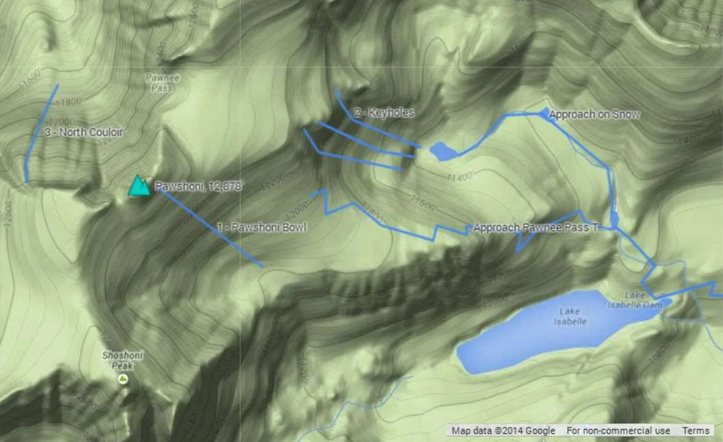 The Pawshoni Bowl is the north end of a large cirque containing this route and the Shoshoni Bowl. This face is wide enough to offer several different lines and it can easily be combined with Shoshoni Bowl, Keyholes, and Pawnee Peak for more runs. If you are done skiing for the day and leaving from the bottom of this route do not ski into the cirque drainage heading southeast towards Lake Isabelle. The bottom of this cirque is rocky, thin, and cliffed out. Retrace your entrance or the approximate line of Pawnee Pass Tail and stay north of the large cliffs above Lake Isabelle.